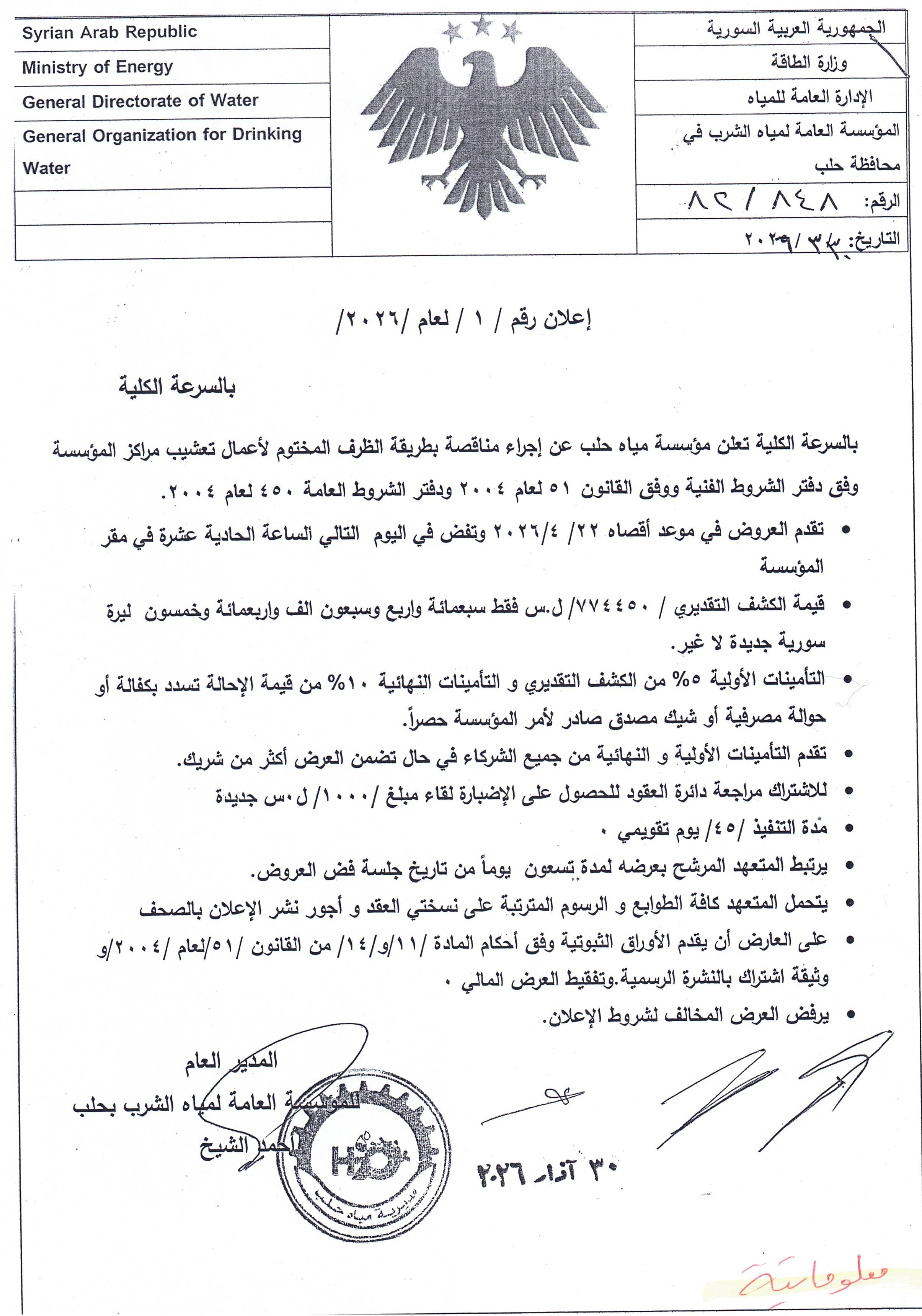 بالسرعة الكلية تعلن مؤسسة مياه حلب عن إجراء مناقصة بطريقة الظرف المختوم لأاعمال تعشيب مراكز المؤسسة